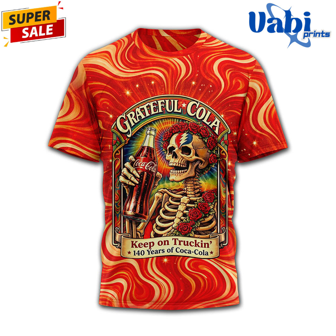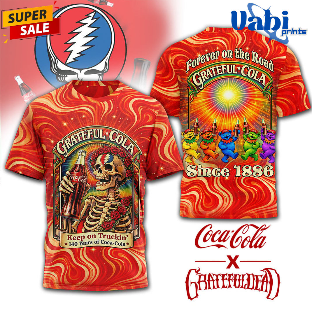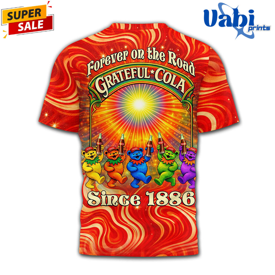 The front showcases the iconic “Grateful-Cola” logo with a skeleton playing guitar and the classic “Keep on Truckin’… sip by sip of Coca-Cola” twist. The back delivers an epic scene with the Grateful Dead bears dancing around a radiant sunburst, proudly proclaiming “Forever on the Road – Grateful-Cola Since 1886”.