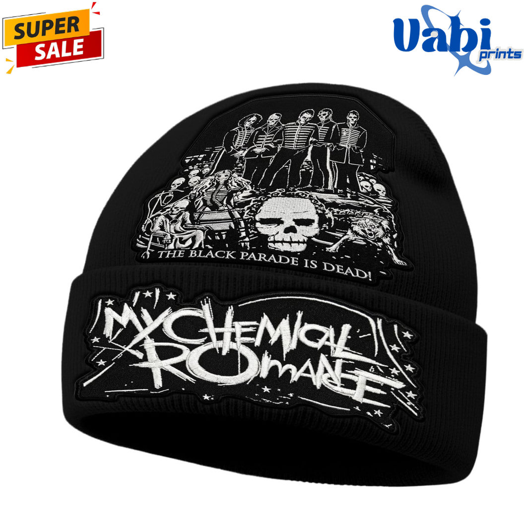 This sleek black beanie features bold white embroidered text across the front cuff that reads “THE BLACK PARADE IS DEAD!” — the iconic line from the legendary album. The top showcases a detailed embroidered graphic of the Black Parade marching band with skulls, crosses, and the classic “Welcome to the Black Parade” artwork.